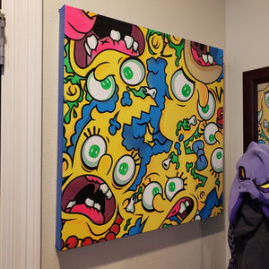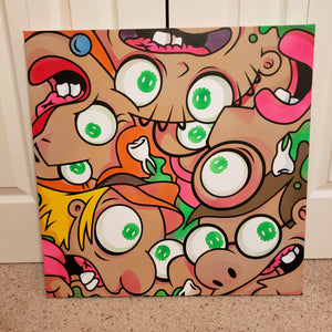 Each piece is illustrated and painted by Chris in his unique spray paint style.